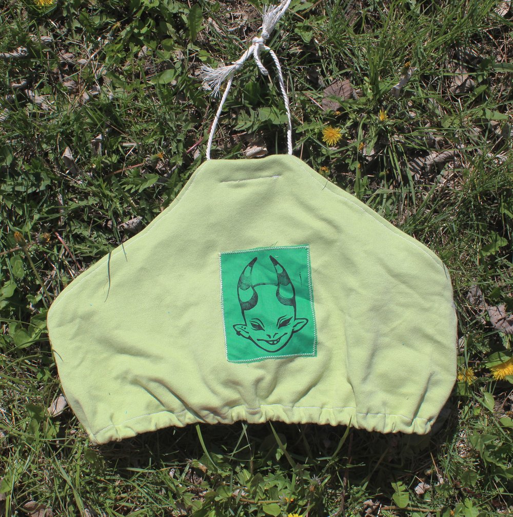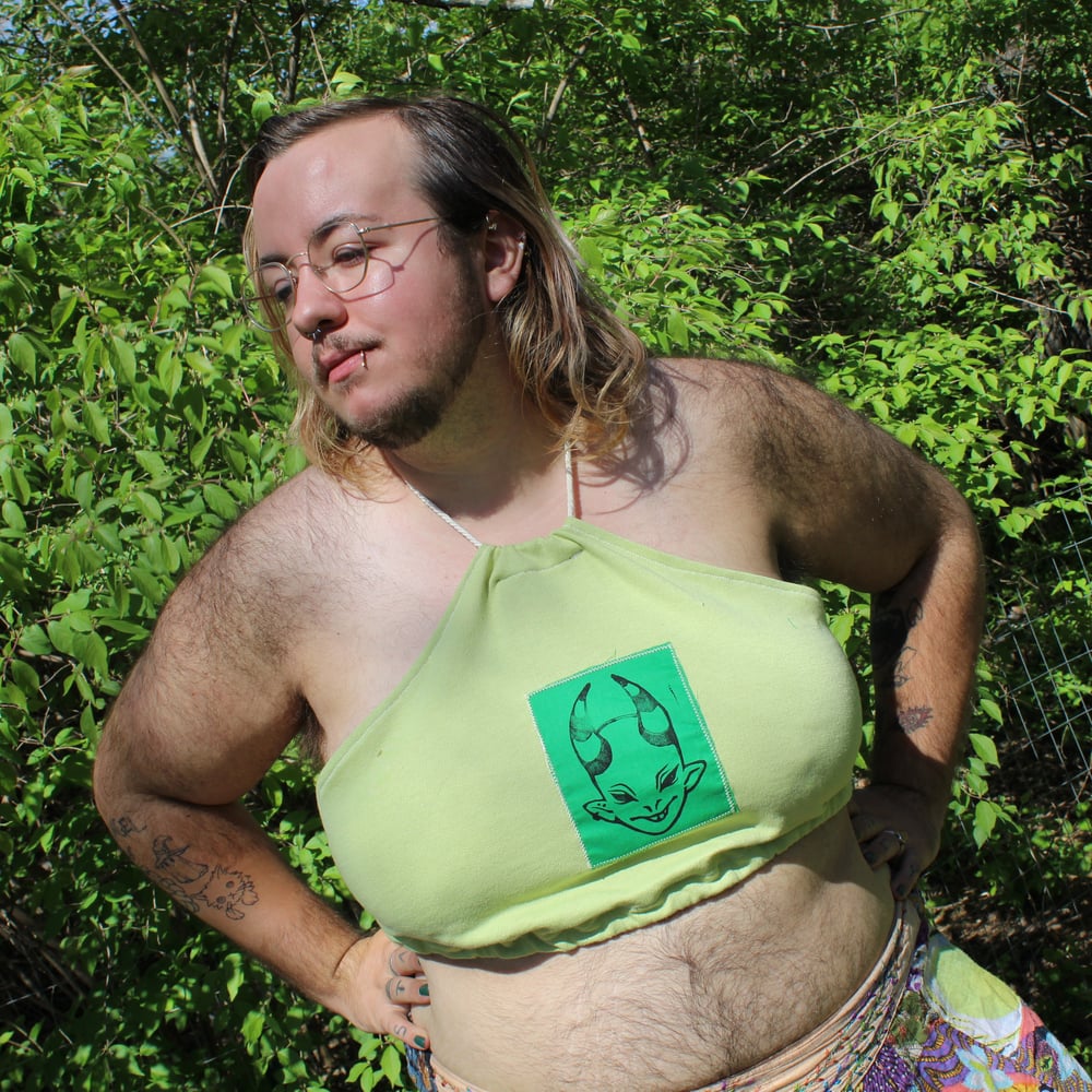 Tie back halter top made of terrycloth with applique detail, fits bust measurements 42-46